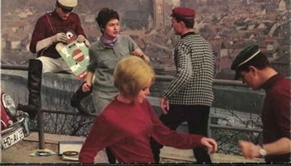 Students in Heidelberg "Twisting" to records played by portable "Singer" phonograph. c. 1970 (PM-2295)