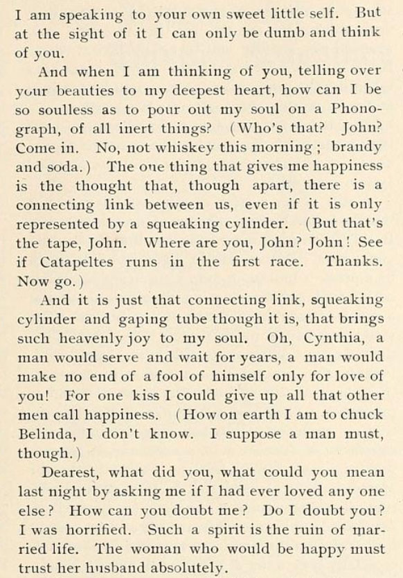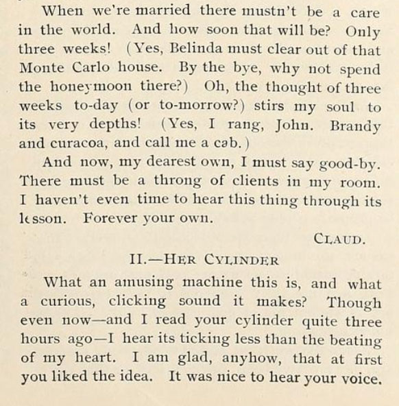 This story appeared in the monthly phonograph trade magazine The Phonoscope in March 1899. Because Cynthia had the "charming idea" to use the Phonograph for talking with each other when she and her fiancé, Claud, were apart Cynthia learns the truth about Claud. And her conclusion is of course a strong endorsement for owning a Phonograph when she says: "The Phonograph has been decidely a success. Nothing on the debit side at all."