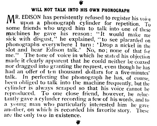 FACTOLA, April 1898 - Thomas A. Edison will not talk into his own phonograph. He has persistently refused and gave as his reason: "It would make me sick with disgust," he explained, "to see placarded on phonographs everywhere I turn: 'Drop a nickel in the slot and hear Edison talk.' No, no; noe of that for me."