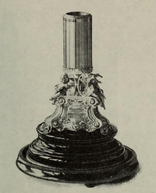"The stand supporting the gold record presented to Mr. Edison is made in solid sterling silver, ornamented with solid gold inlay and surmounted with three beautifully modelled figures, representing music, art and progress. On the sides of three panels are imbedded a portrait of Mr. Edison and appropriate inscriptions of the event." (Ibid.)