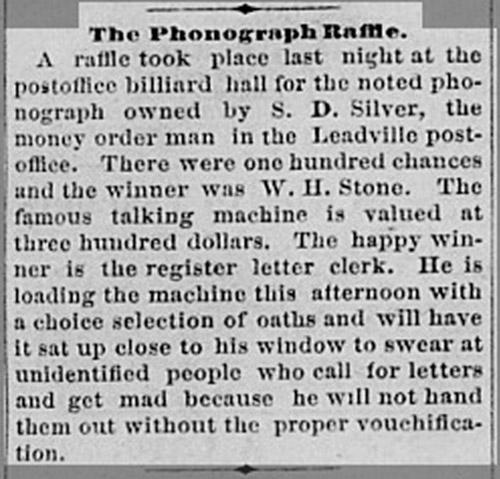 It is known that one of Edison's 1878 tin-foil phonographs (a Bergmann Exhibition model phonograph) was purchased in September 1878 by a Mr. S. D. Silver who lived in Leadville, Colorado (elevation 10,151 feet). (1) Silver exhibited the phonograph around the country and later raffled it, reportedly won by the Leadville post office letter register clerk W. D. Stone in July 1879. The clerk was said to have recorded a "choice selection of oaths" and then placed the phonograph in the Leadville post office window where it could "swear at unidentified people who call for letters and get mad because he will not hand them out without the proper vouchification."