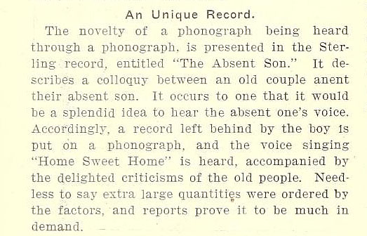 FACTOLA, January 1907 - "A phonograph being heard through a phonograph is presented in the Sterling record, entitled "The Absent Son."