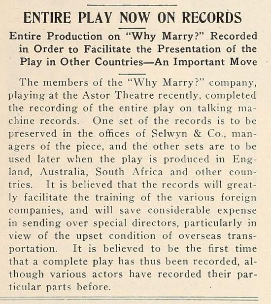FACTOLA, March 1918 - The play "Why Marry?" is believed to be the first time the complete play has been recorded on talking machine records by all actors in the play.