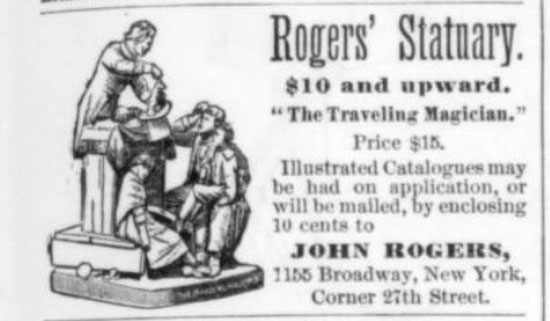 "The Traveling Magician" advertisement, March 30, 1878 Harper's Weekly showing 1155 Broadway as the address for the John Rogers studio.