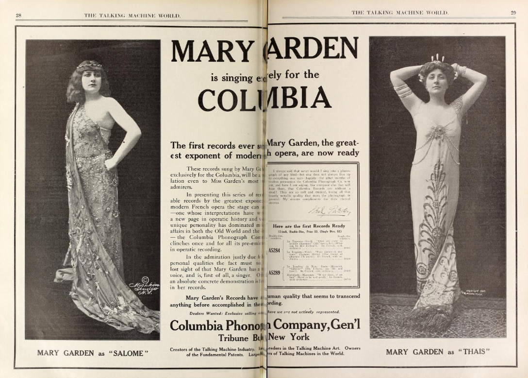 Columbia Records featuring Mary Garden and Olive Fremstad, 1916. Hearst’s, June 1916.