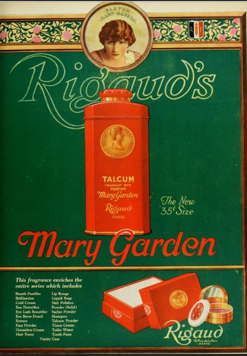 The Queen of Sheba never had a "harmonious fragance such as Mary Garden Perfume which is identified with the spirit and personality of the great soprano herself." December 1916, Life.
