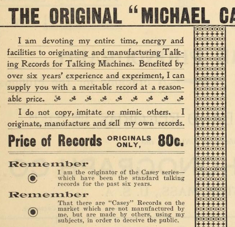 Hunting, as the original "Michael Casey", saw his 'Casey' character stolen by other performers and record companies. In a full page ad in The Phonoscope's November 1906 edition Hunting wanted to make it clear that his Casey records had set the standard and that he didn't "copy, imitate or mimic others." Said Hunting. Others that make "Casey Records" using my subjects...deceive the public."