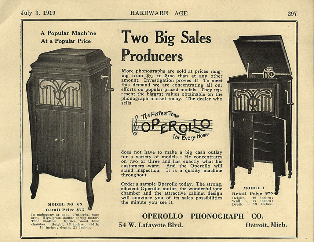 Operollo – Operollo Phonograph Co., 54 W. Lafayette Blvd., Detroit, Mich. July 3, 1919 Hardware Age Catalogue* - Not counted in the total number of '-ola' brands as etymology is one degree of separation.