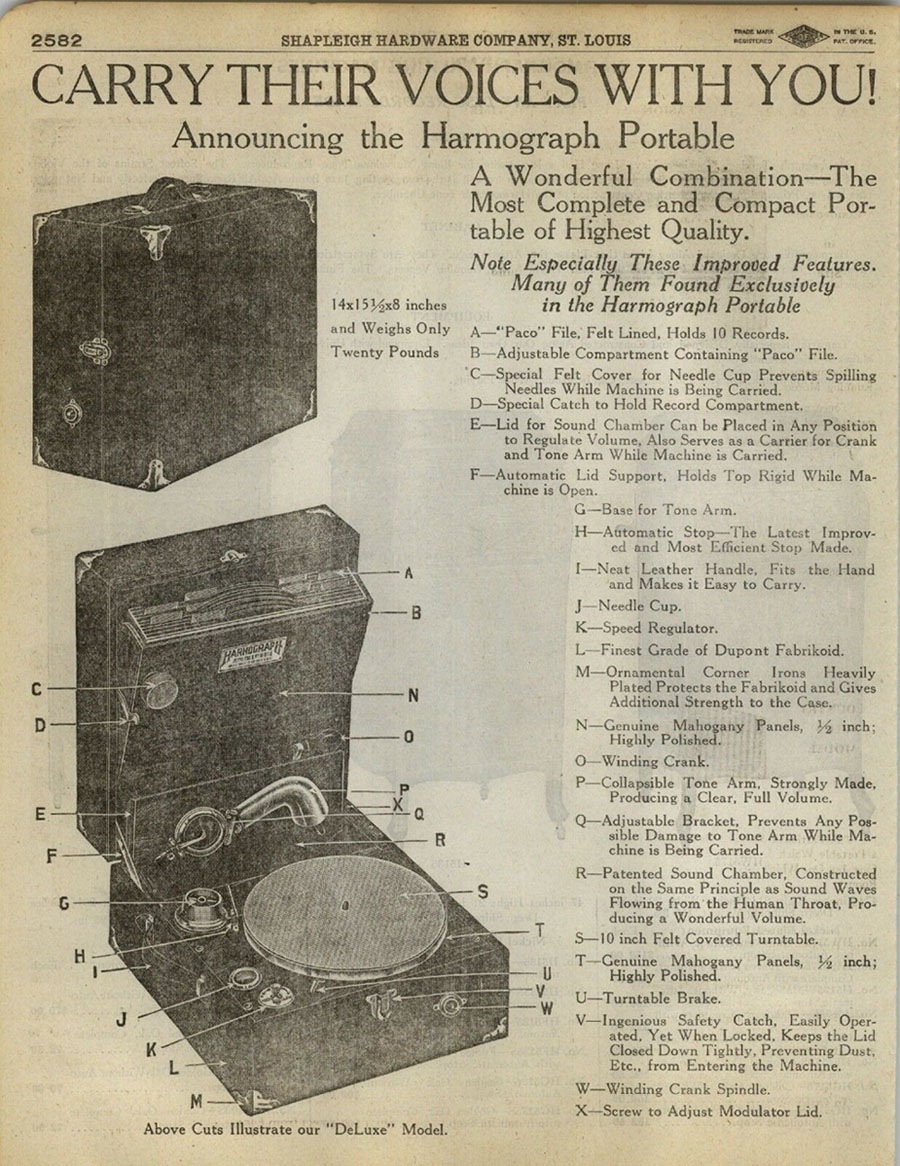 Harmograph – Harmograph Talking Machine Company, St. Louis, Missouri. 1923 Shapleigh Hardware publication - Portable Harmograph