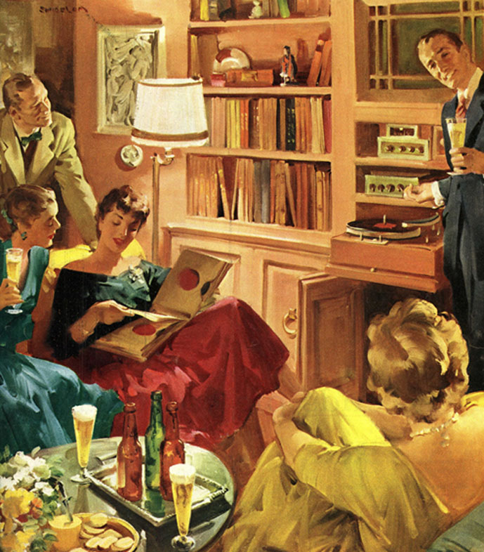 This painting titled "Hi-Fi" from the series "Homelife in America" by Haddon Sundblom featured friends with cold glasses of beer listening to state-of-the-art music from the component high fidelity phonograph system. The ad and its image, sponsored by the United States Brewers Foundation, is extracted from a 1956 Collier's magazine ad.