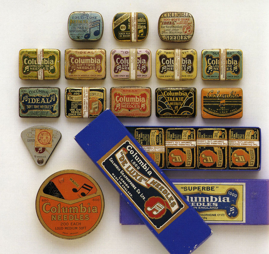 Phonograph needles were sold in colorful tins of 200 like these and in paper packages.