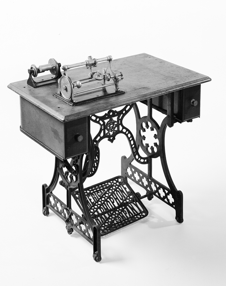 In these early commercial machines, the dictation apparatus sat atop a sewing machine table and employed a treadle to rotate the mandrel holding the cylinder recording.