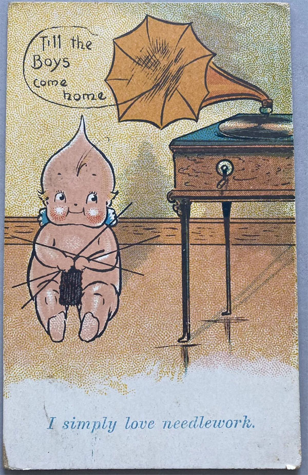 Kewpie with knitting needles listening to Gramophone playing "Keep the Home-Fires Burning (Till the Boys Come Home)," circa 1915.