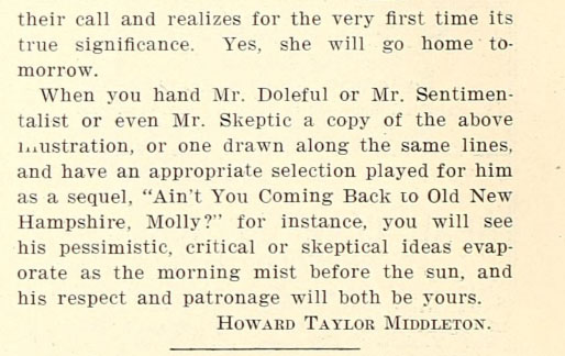 The appeal made in the following article asks the dealers to emphasize that the talking machine as an instrument that has the "human quality that he expected to find after reading the many advertisements lauding the talking machine." The suggestion is to have an artist draw an attractive cartoon "to stir ones thoughts to the higher things in life...."This sketch should tell in striking manner the story of the sentimental side of the talking machine."