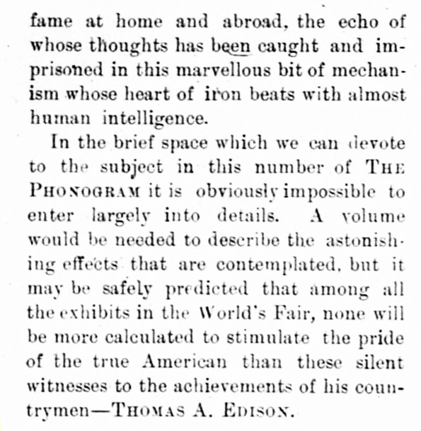 Description of the Electrical Building and the North American Phonograph Company Exhibits. The Phonogram, March and April 1893 pp. 354-356.