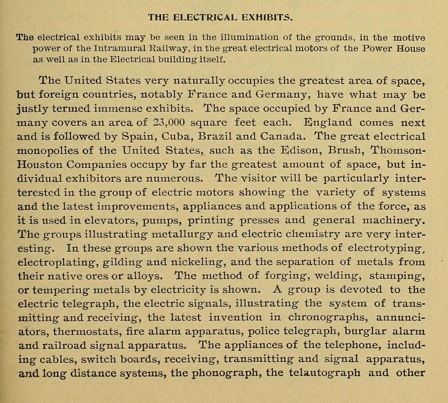 Included In the Electrical Exhibits in the Electricity Building are the phonograph, and "the new Kimetograph, invented by Edison, which transmits scenes to the eye as well as sounds to the ear." Ibid, pp. 61-62.