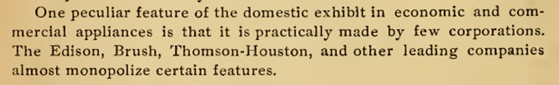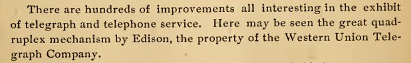 Edison's quadruplex mechanism was on display in the Electricity Buildings exhibit of telegraph and telephone service.