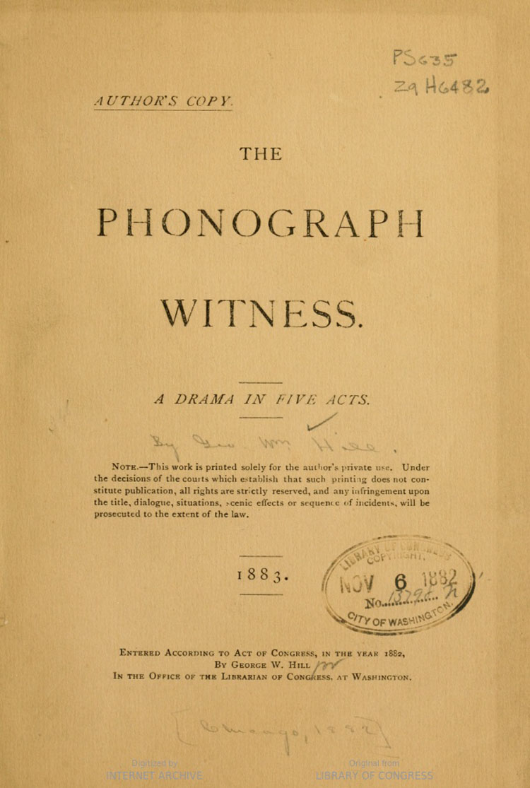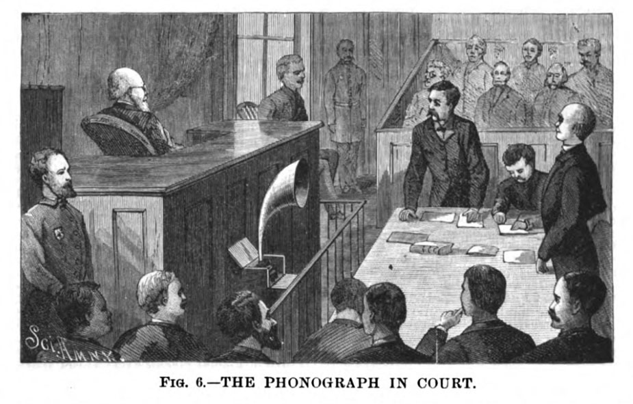 For an example of the Phonograph playing a 'canny witness" role in an 1883 drama which features a room called a "Phonographic Chamber" where all sounds heard are recorded by "an accurate though invisible, reporter," read The Phonograph Witness in PhonoBooks.