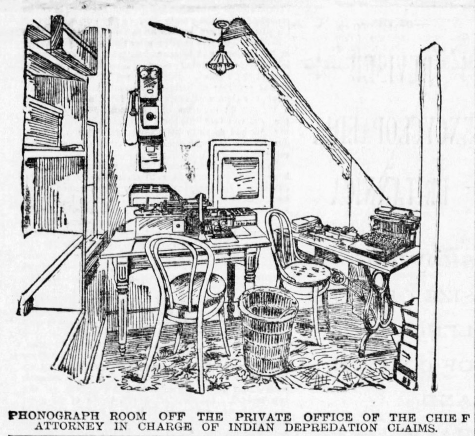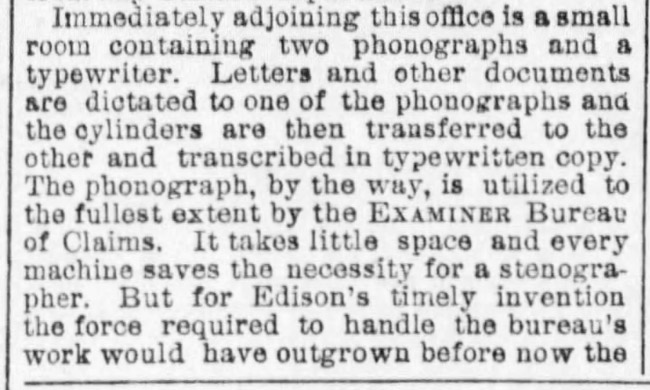 An article three years later in the Weekly Examiner's March 24, 1892 edition provided evidence that the phonograph was a dictating machine reality in the modern office with a full description of how the office of the "Examiner Bureau of Claims" in Washington, D.C. implemented a "Model Arrangement of Offices -- Electricity, the Phonograph, and All Modern Aids" for use in the Bureau.
