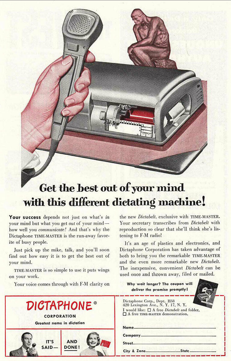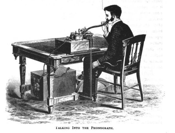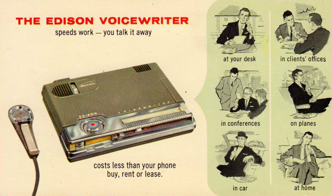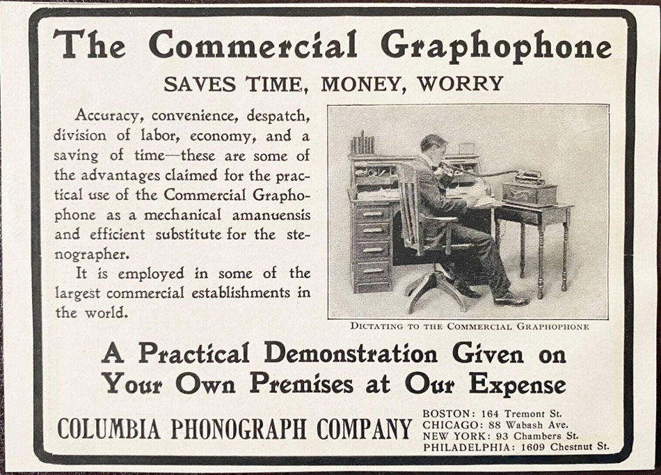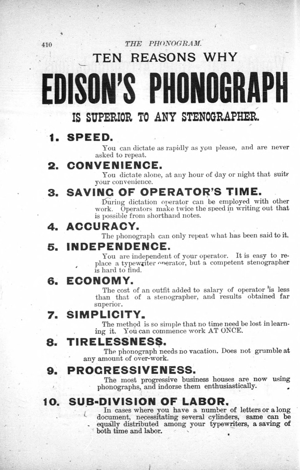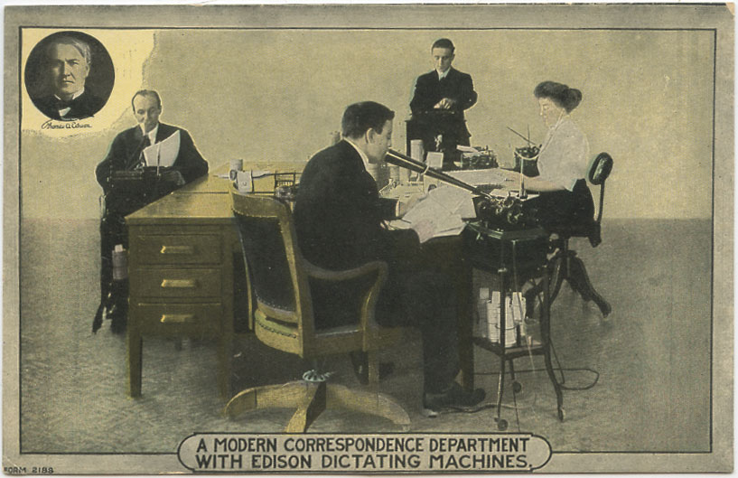 When he invented the phonograph in the 1870s, Edison and others assumed that the machine’s ultimate value would be for business. By the 1890s, it was praised as “a stenographer which will take with unfailing accuracy from the most rapid dictation, which never goes out to ‘see a man,’ which is ready for work at any hour of the day,…which is never dissatisfied, sick or ‘looking for a raise.’” One problem the machine faced (beyond complaints of its complexity and proclivity to breaking down) was the flip side to this praise.
