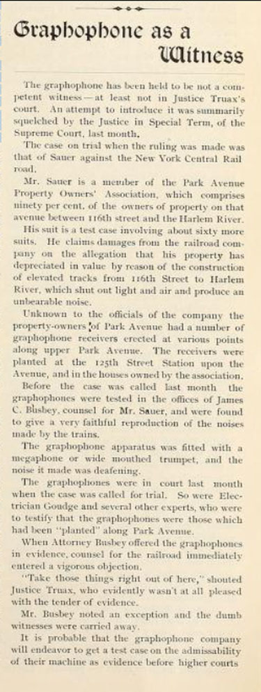 Phonograph recording brought into court to prove the nuisance sounds of "engines tooting and cars rattling" impacting the property value of a hotel. The New York Times, November 15, 1906