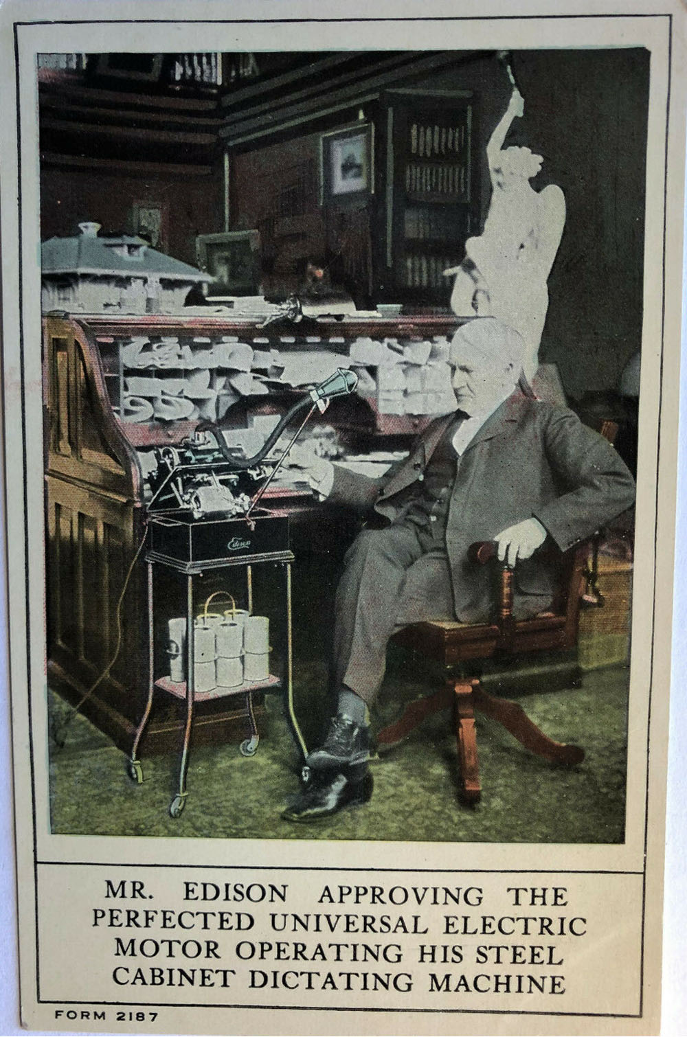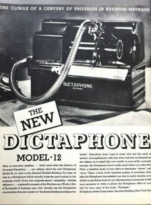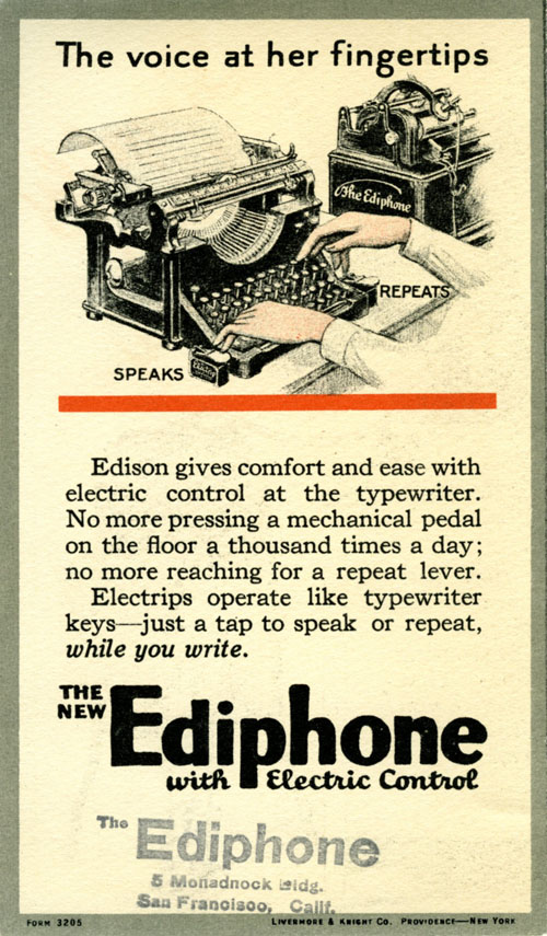 Visit the Early Office Museum™ for more information and examples about dictation machines and their use in earlier offices. The Early Office Museum "engages in research on the history and evolution of offices, antique office machines and equipment, and business technology based on original documents, artifacts, and vintage photographs." Of special interest for Friends of the Phonograph is their Antique Dictating Machines webpage.