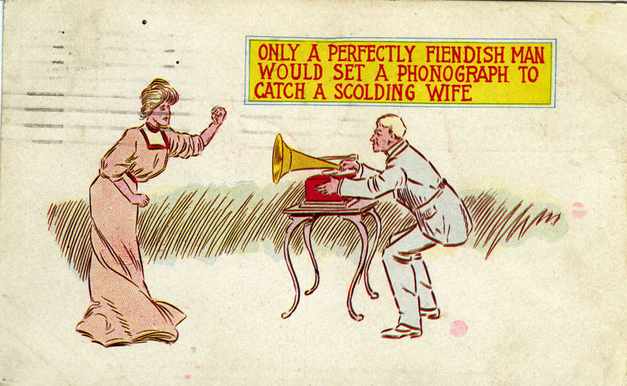 This cartoon from a 1908 postcard shows how recorded words from a domestic discussion can potentially be used as 'evidence' of a conversation. Note: "Set a Phonograph" means to place the needle on a record so that it will record what is said.