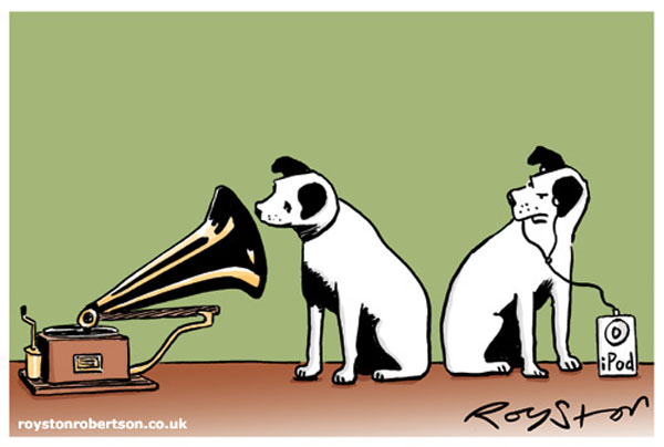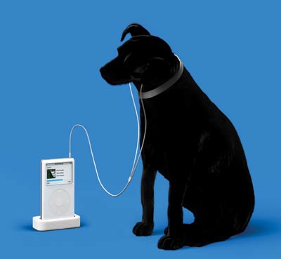 to Nipper, listening to an Apple video iPod