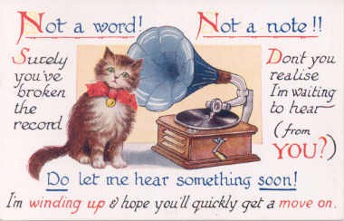 cat takes the place of Nipper in this postcard that depicts