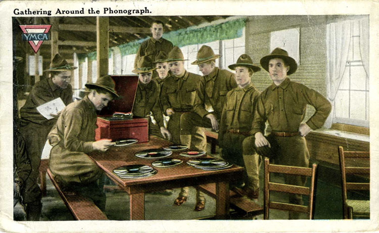 showing US Army personnel listening to a disc playing "Victrola"
