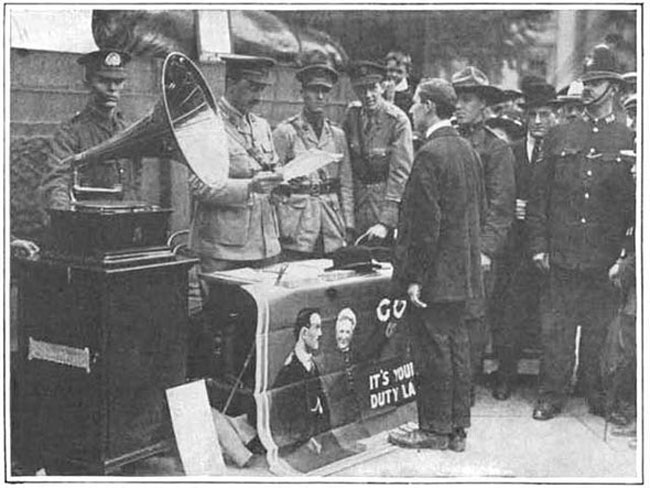in Britain uses a phonograph to help drum up business in 1915.