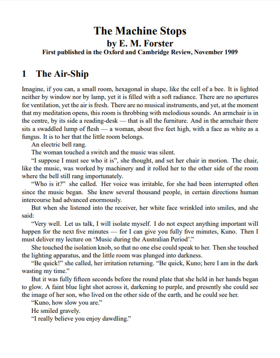 To read the rest of "The Machine Stops" go to The University of California, Davis web page. Additionally, there are public domain audio books on the intranet of this story.