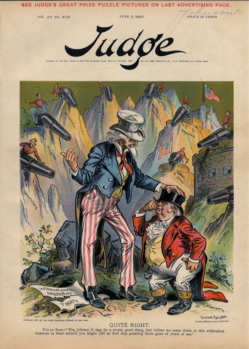 - "BRITISH ARROGANCE", PUCK, February 1887