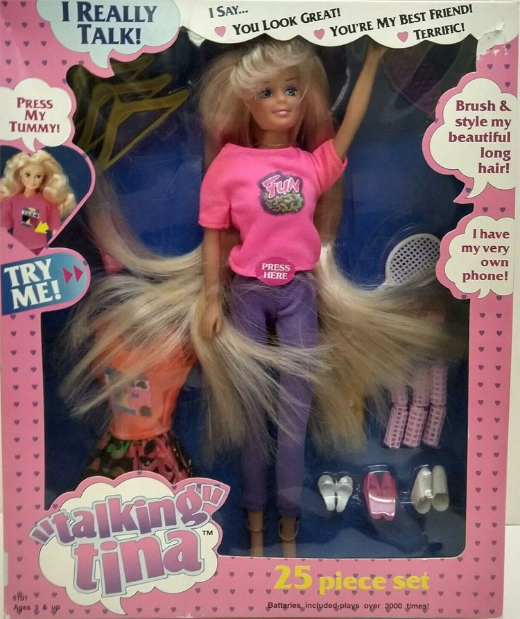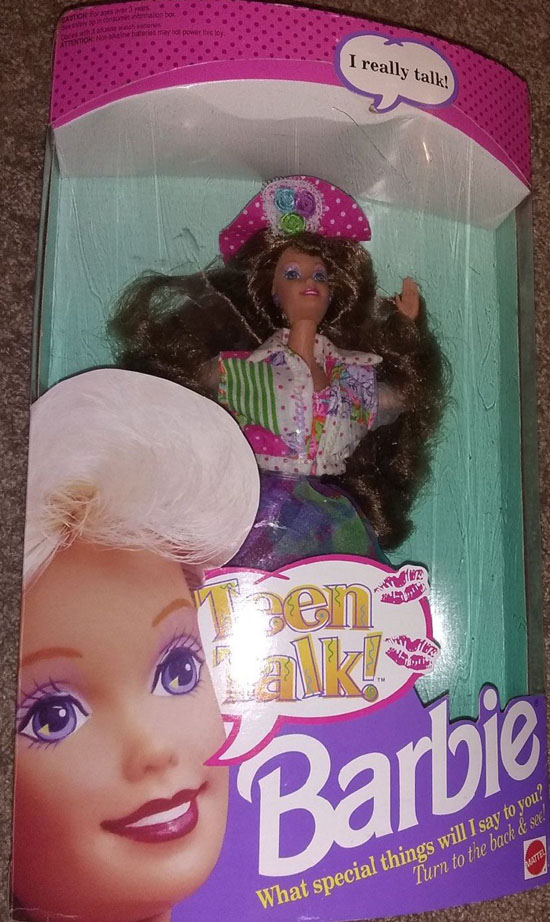 Teen Talk Barbie was introduced at the 1992 American International Toy Fair and became available for sale for about $25 in July that year.[1][2] 350,000 were produced. The dolls contained a voice box programmed with a random assortment of four phrases out of 270 possibilities, including "Will we ever have enough clothes?", "Let's plan our dream wedding!", "I'm studying to be a doctor", "Wanna have a pizza party?", "Want to go shopping?", "Okay, meet me at the mall", "Wouldn't you love to be a lifeguard?", "Let's have a campfire", and "Math class is tough."