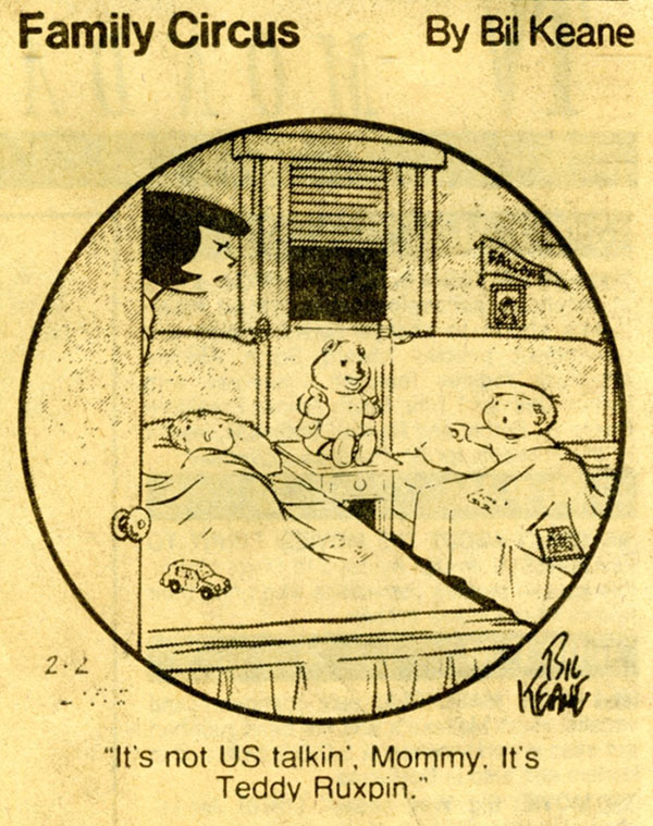 The father's humor is a bit questionable (as the mother correctly questions what's so funny about trying to confuse a baby?). But if you grew up in this era you can probably still hear the distinctive sound of pulling the chatty-ring and remember the variety of the See 'N Say talking toys.